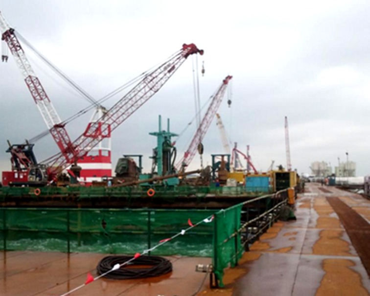 2016年3月我公司承擔了在舟山-秀山島附近我國第一座(世界單機最大容量)3.4兆瓦”潮流發電總成平臺“樁基(包括直樁、斜樁)嵌巖樁施工。在此工程中我們克服了流急(每秒-5m)、漩渦等自然條件,成功地在海底中風化裸巖上進行了準確無誤的施工。